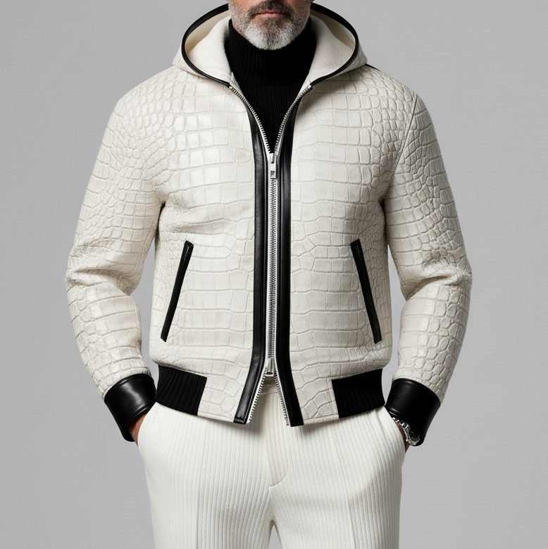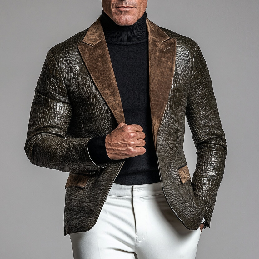 Men's Retro Peak Lapel Patchwork Alligator Pattern PU Leather Blazer