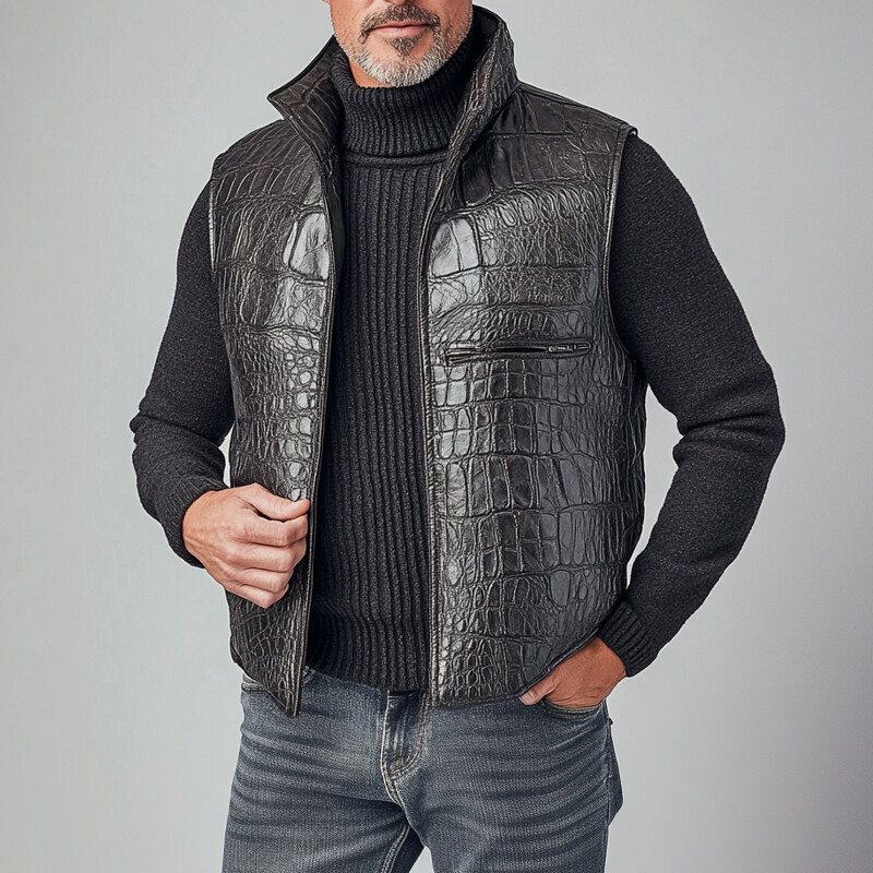 Men's PU Leather Stand Collar Slant Pocket Zip Up Vest