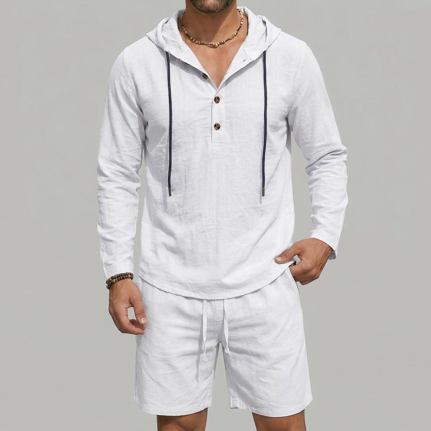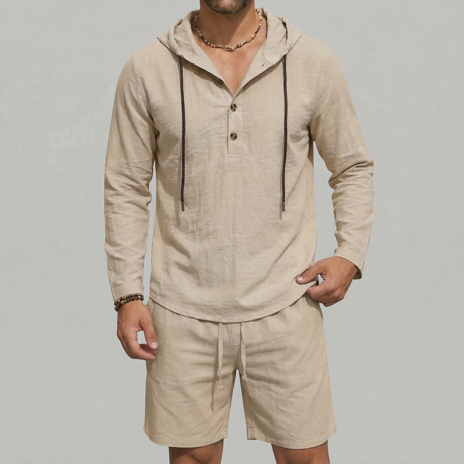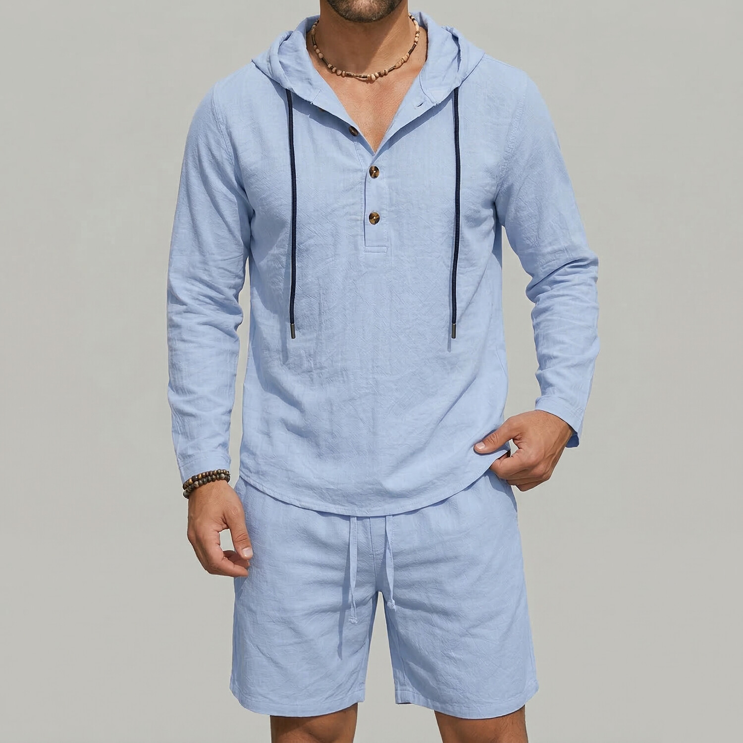 Men's Casual Plain Drawstring Long Sleeve Hooded Shirt & Slant Pocket Shorts 2Pcs Set