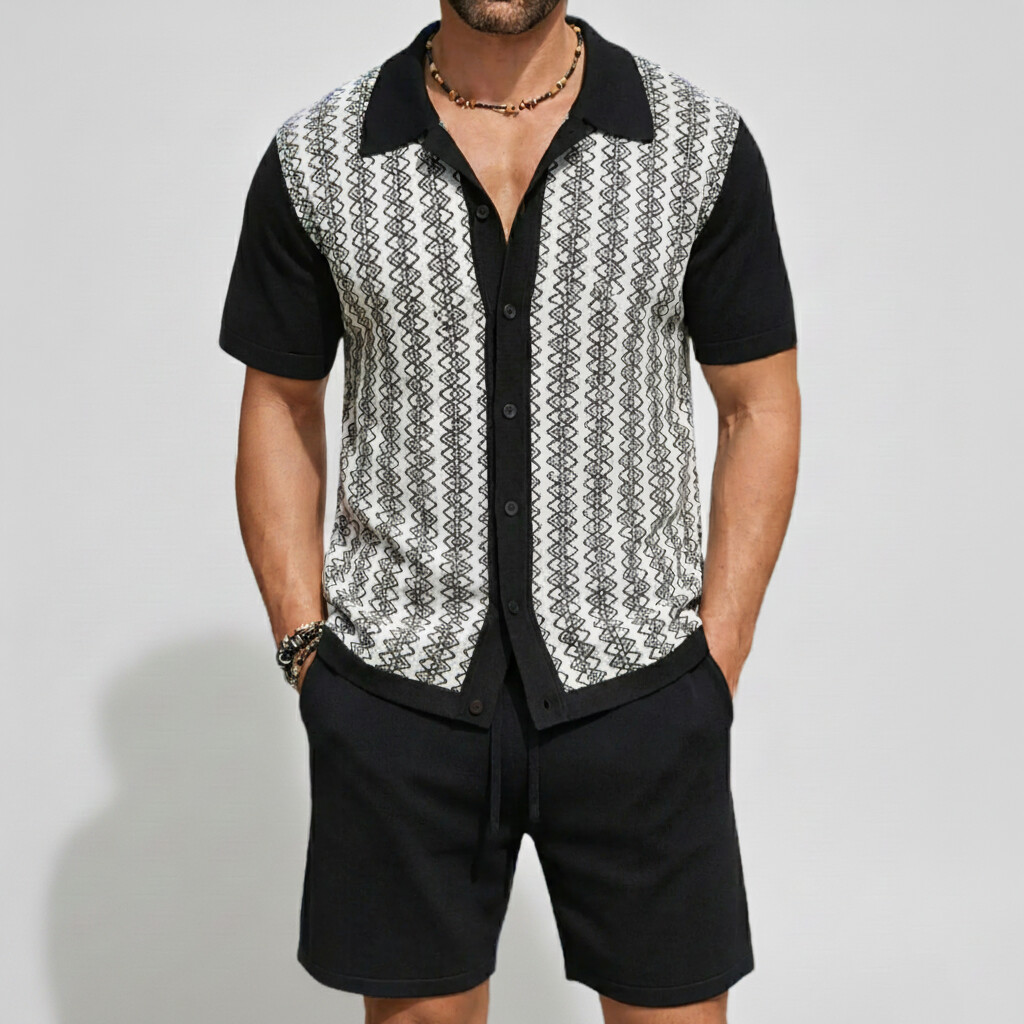Men's Vacation Color Block Short Sleeve Jacquard Knit Shirt & Shorts 2Pcs Set