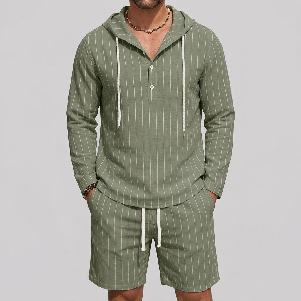 Men's Pinstripe Print Long Sleeve Half Placket Hooded Shirt & Drawstring Shorts 2Pcs Set