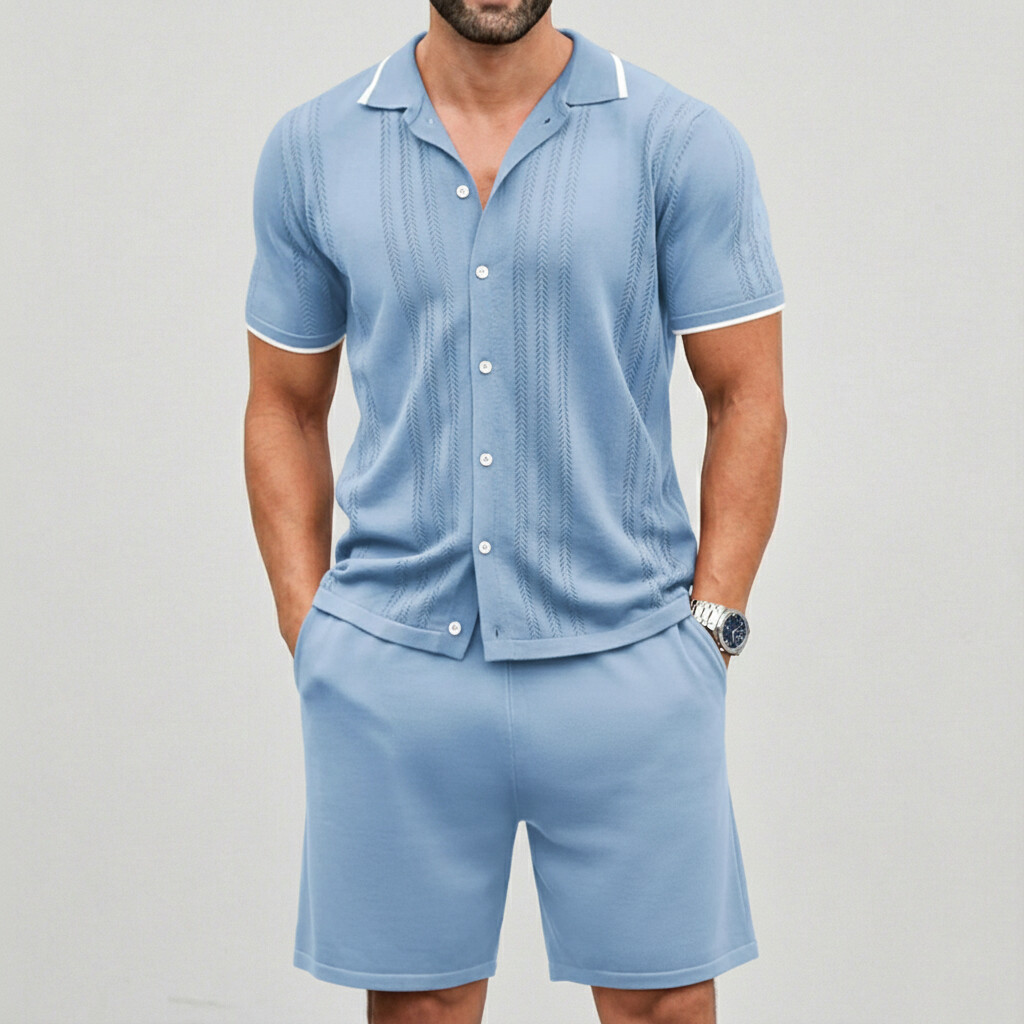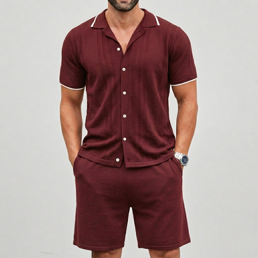 Men's Casual Breathable Contrast Trim Short Sleeve Shirts & Shorts 2 Pcs Set