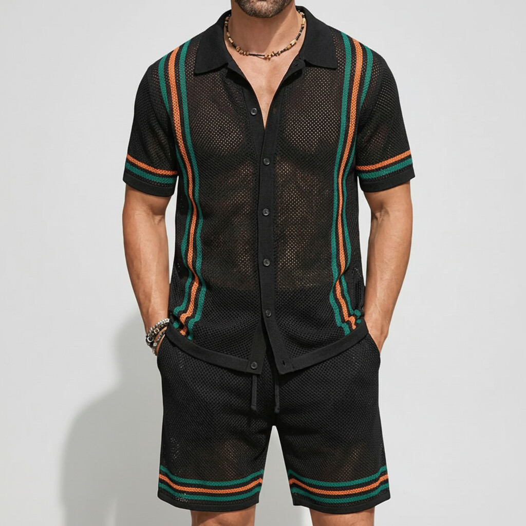Men's Vacation Contrast Striped Short Sleeve Mesh Knit Shirt & Drawstring Shorts 2Pcs Set